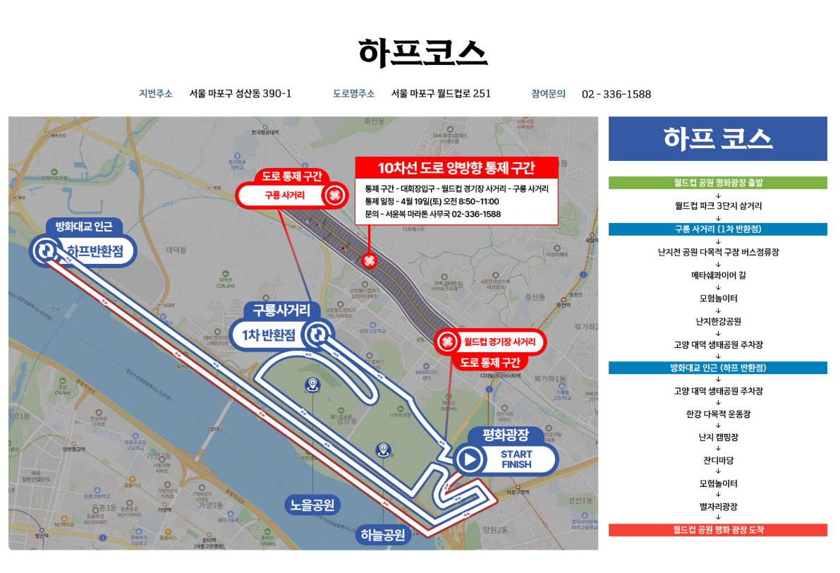 월드컵 공원 평화광장 출발 → 월드컵 파크 3단지 삼거리 → 구룡 사거리 (1차 반환점) → 난지천 공원 다목적 구장 버스정류장 → 메타쉐콰이어 길 → 모험놀이터 → 난지한강공원 → 고양 대덕 생태공원 주차장 → 방화대교 인근 (하프 반환점)