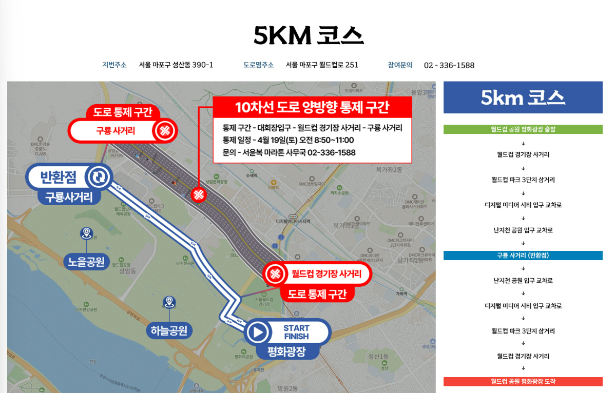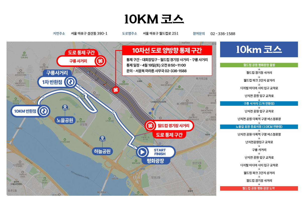 월드컵 공원 평화광장 출발 → 월드컵 경기장 사거리 → 월드컵 파크 3단지 삼거리 → 디지털 미디어 시티 입구 교차로 → 난지천 공원 입구 교차로 → 구룡 사거리(1차 반환점) → 난지천 공원 입구 교차로 → 난지천 공원 다목적 구장 버스 정류장 → 노을길 포장 종료지점(10km 반환점)