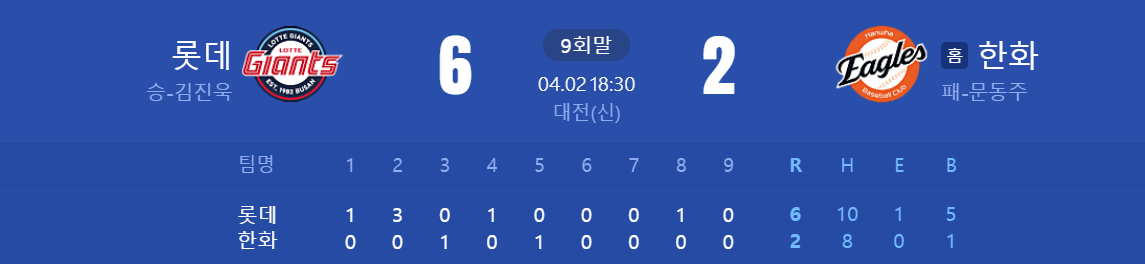 이상으로 4월2일 KBO 한화이글스 VS 롯데자이언츠 경기 리뷰 포스팅 글을 마칩니다!!