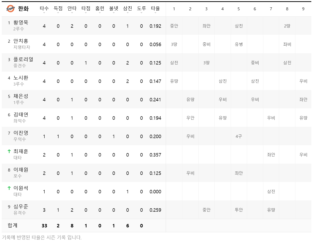 | 4번 타자 | 노시환(3루수) | 레이예스(우익수) |