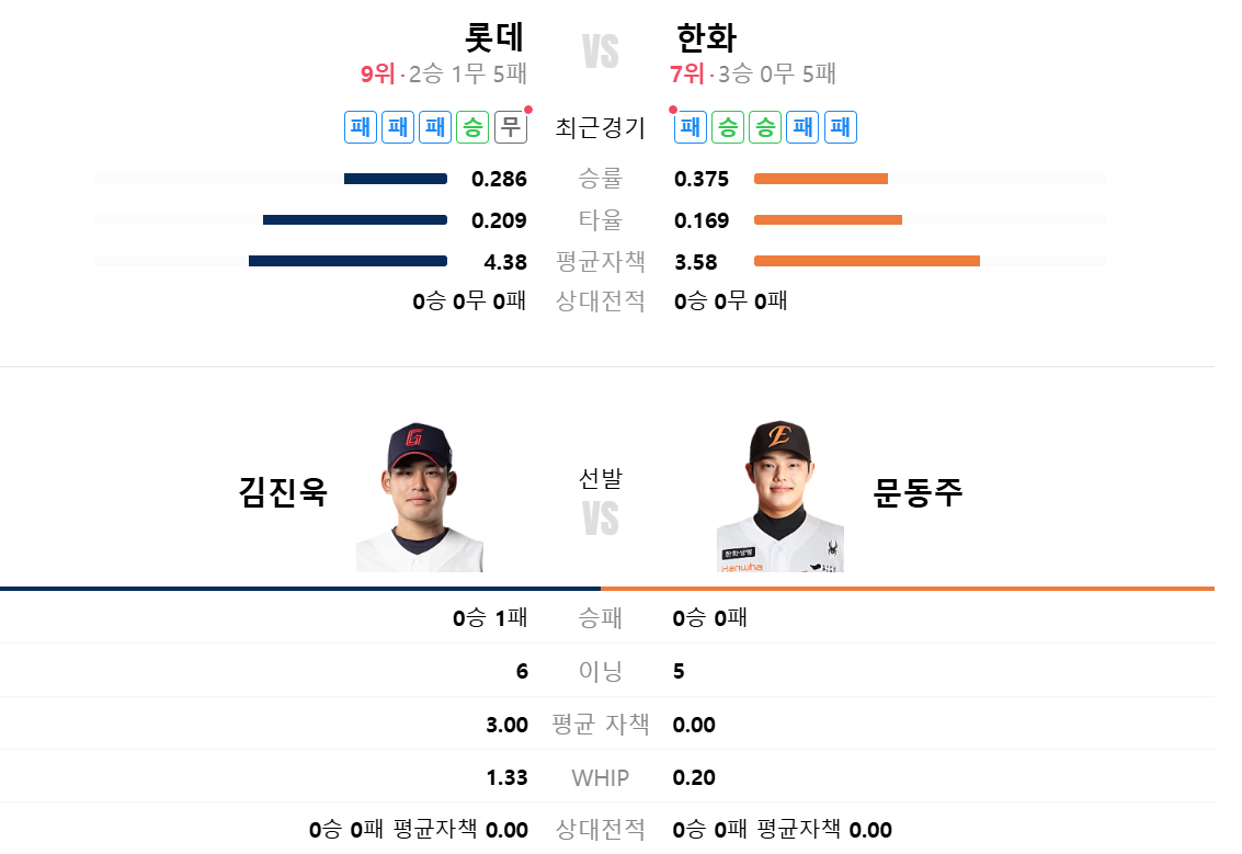 4월2일 KBO 한화이글스 VS 롯데자이언츠 전력 분석, 승부예측, 선발투수