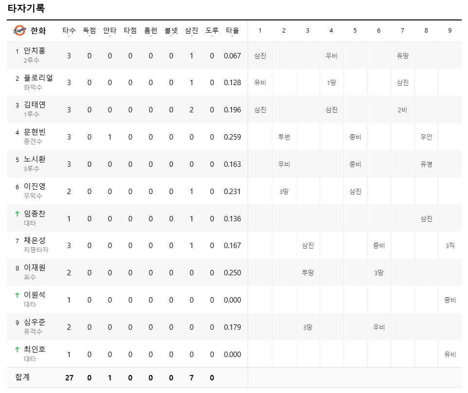 한화이글스 : 0점, 1안타, 1실책