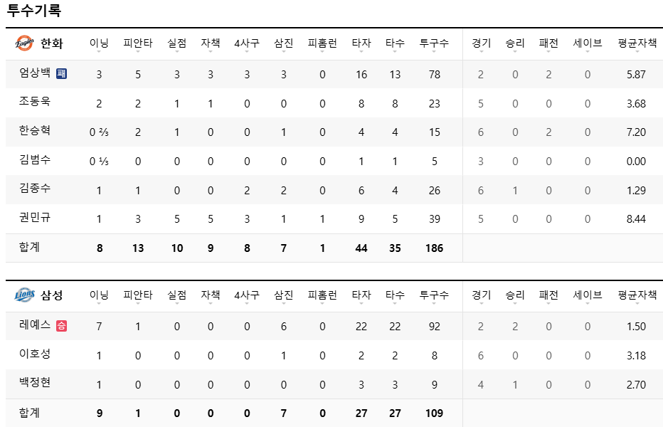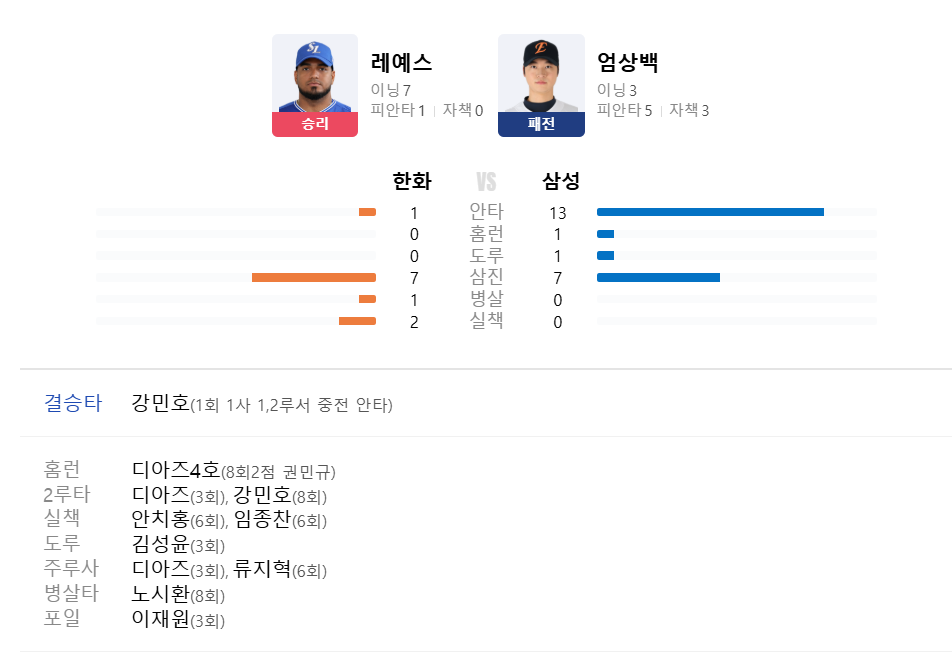 반면 한화 타선은 삼성 투수진을 상대로 단 1안타에 그치며 무득점으로 경기를 마쳤다