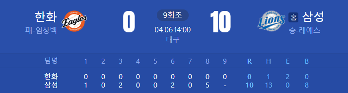 한화 이글스, 삼성라이온즈에 0-10으로 패배!!!