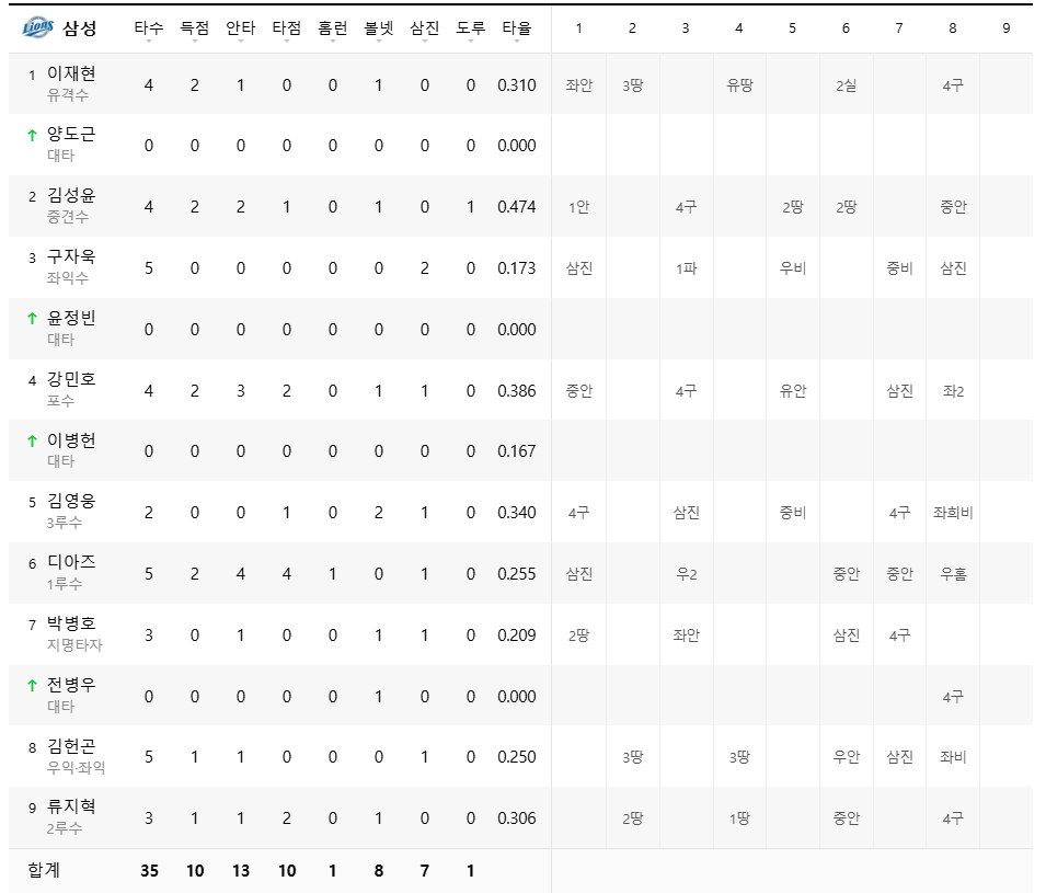 삼성라이온즈 : 10점, 13안타, 0실책