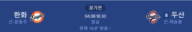 그럼 이상으로 4월8일 KBO 한화이글스 VS 두산베어스 프리뷰 포스팅 글을 마무리 합니다!!