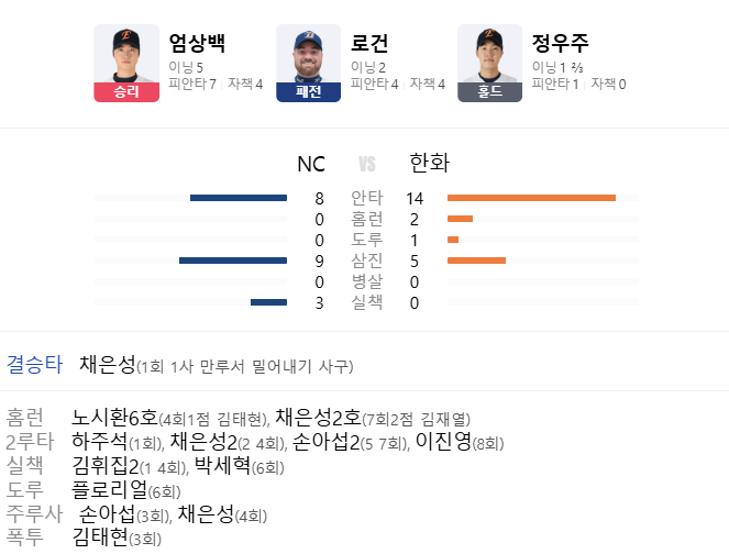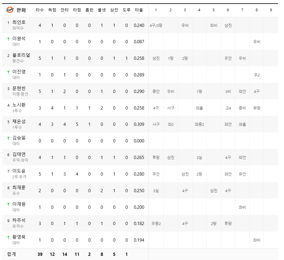 경기결과 14:2 한화 이글스 승