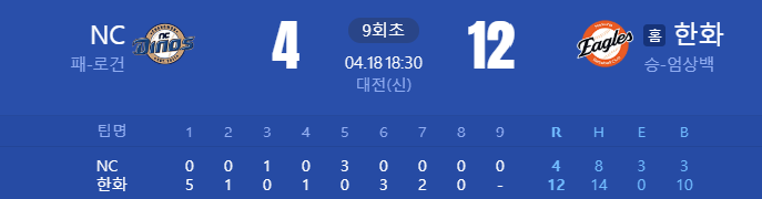 오늘은 4월18일 KBO 한화이글스 VS NC 다이노스 경기 리뷰 포스팅 글을 올려볼게요!