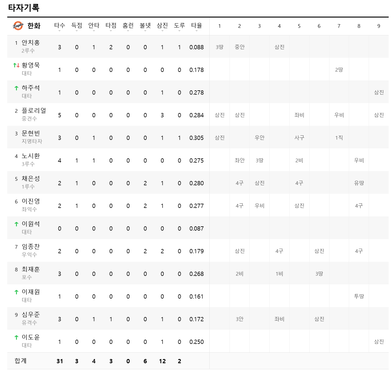 한화 입장에선 류현진이 6이닝 4실점으로 버텼는데...타선이 그 이후 잠잠했네