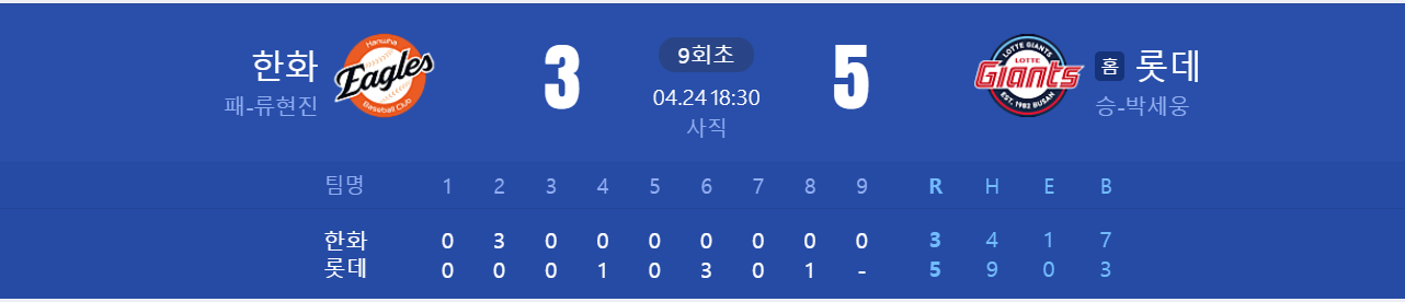 오늘은 4월24일 KBO 한화이글스 VS 롯데자이언츠 경기 리뷰 포스팅 글을 올려볼게요!!