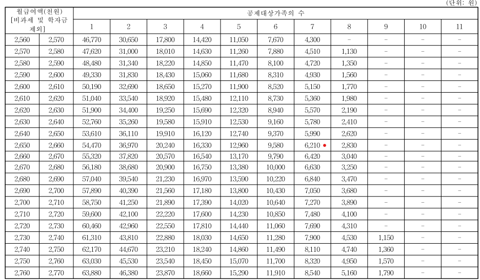 급여와 부양가족수에 따른 소득세 금액은 아래 '근로소득 간이 세액표'를 참고하시면 됩니다.
