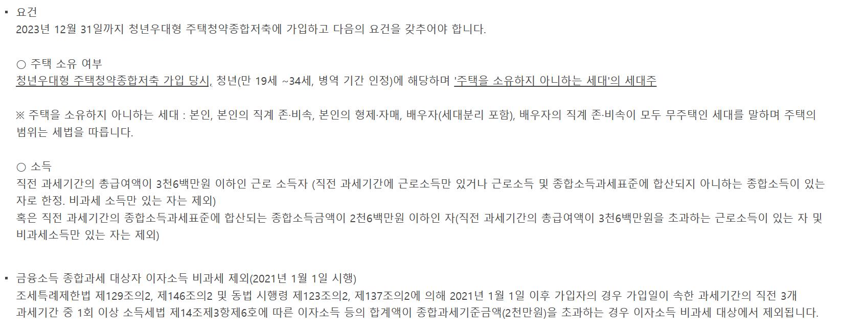 | 주 택 여 부 | ① 본인이 무주택인 세대주 ② 본인이 무주택이며 가입 후 3년 내 세대주 예정자 ③ 무주택세대의 세대원 ※ 다만, ①,②의 세대주는 3개월 이상 유지하여야 함 * 이자소득 비과세 대상 무주택 기준은 상이 (하단 참조) |