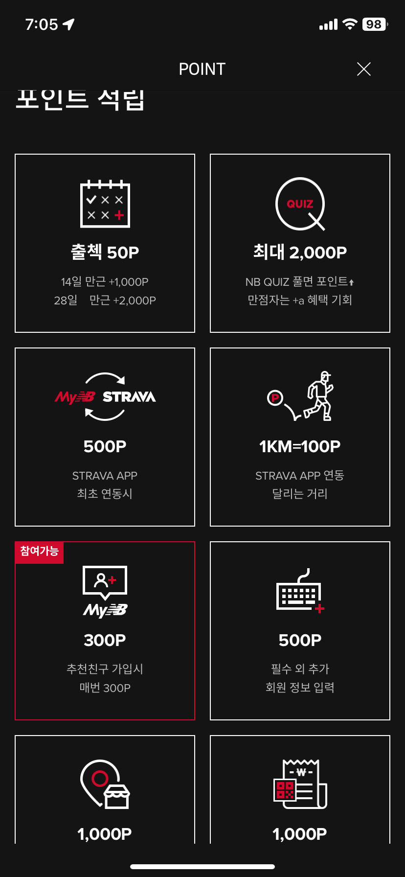 ① 뉴발란스 어플 실행 → 하단에 MY 클릭 → 포인트 적립 클릭 → "STRAVA APP 최초 연동시" 클릭 → 끝